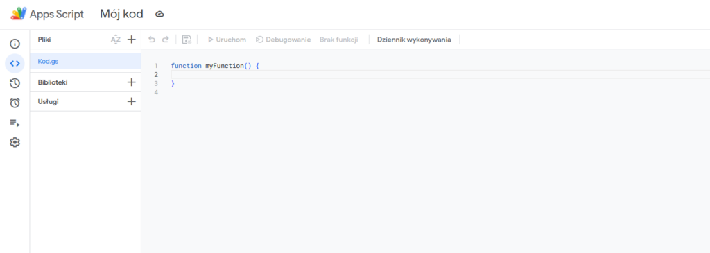 Domyślnie w pliku znajduje się jedna funkcja dodana przez system o nazwie myFunction, jest to nic innego jak po prostu funkcja w języku programowania JavaScript. Zazwyczaj pierwszym kodem pisanym w nowym środowisku jest jakiś prosty console.log – tak też zrobimy w tym przypadku.