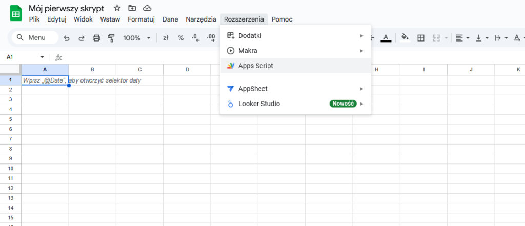 Aby utworzyć swój pierwszy skrypt w Google Apps Script musisz stworzyć nowy plik w Arkuszach Google. Po utworzeniu pliku wprowadź jego nazwę i przejdź do pozycji w menu o nazwie Rozszerzenia a następnie kliknąć w Apps Script.