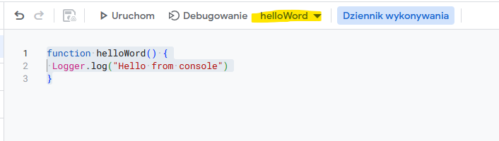Z racji tego, że jest to JavaScript dostępny w silniku stworzonym przez Google nie mamy dostępu do natywnej funkcji console.log(), zamiast tego do debbugowania elementów korzystamy z dedykowanej funkcji Logger.log(). Aby uruchomić funkcję musisz nacisnąć przycisk Uruchom w górnej części menu, upewnij się, że odpowiednia funkcja została wybrana.